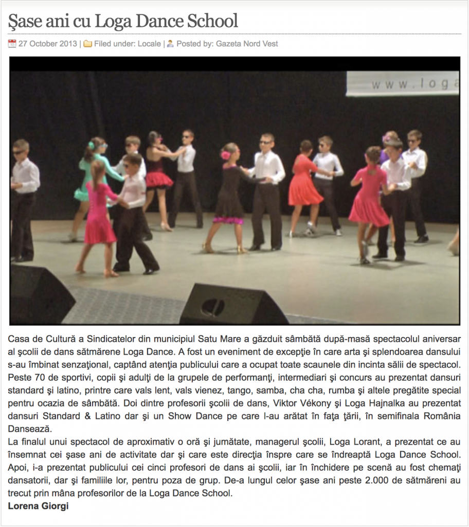 28 Octombrie 2013 (Magyar Hirlap) Evfordulot unnepelt a Loga Dance School Fennallasanak hatodik evfordulojat unnepelte oktober 26-an, szombaton, a Szatmarnemeti Szakszervezetek Muvelodesi Hazaban, a Loga Dance School […]